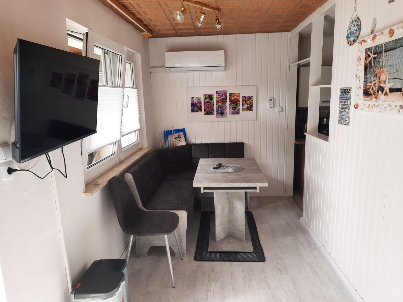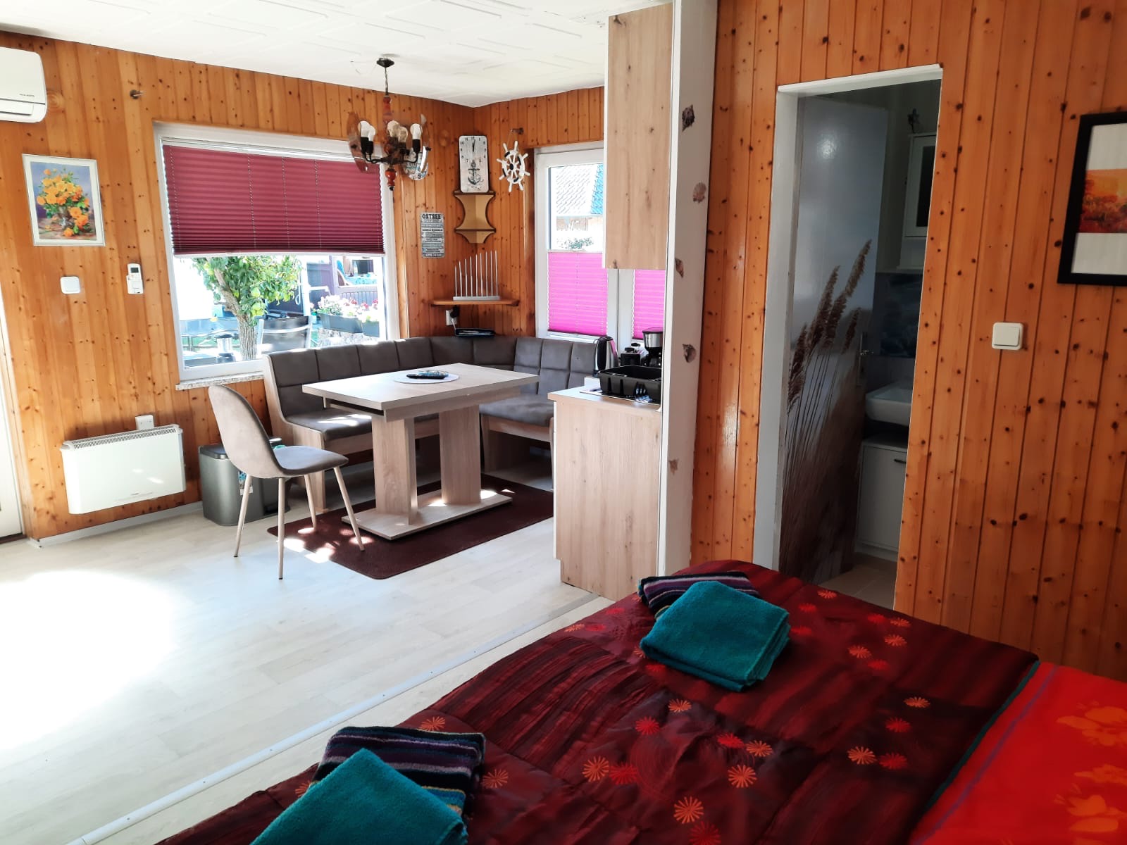 Bungalow 2: Etwas geräumiger – komfortabel eingerichtet mit Wohnbereich, Küche, Schlafzimmer und Terrasse.